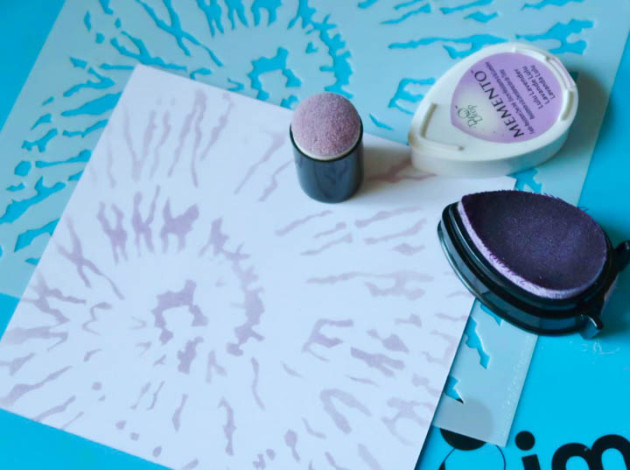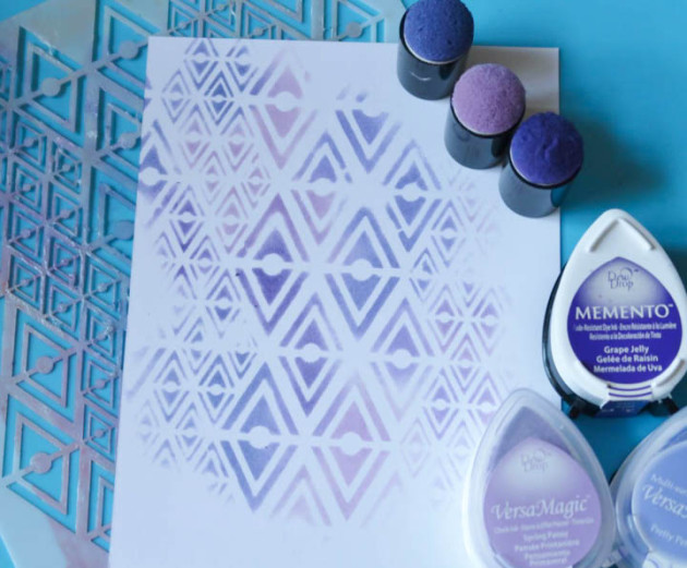 Randomly sponge 2 or more inks through a stencil. Here I used Memento which is a dye ink and VersaMagic which is a pigment ink.