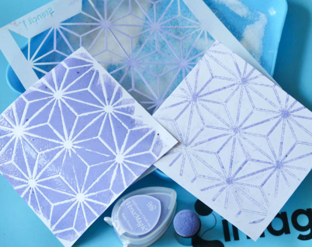 Sponge a pigment ink over a stencil; remove the stencil; sprinkle with embossing powder…