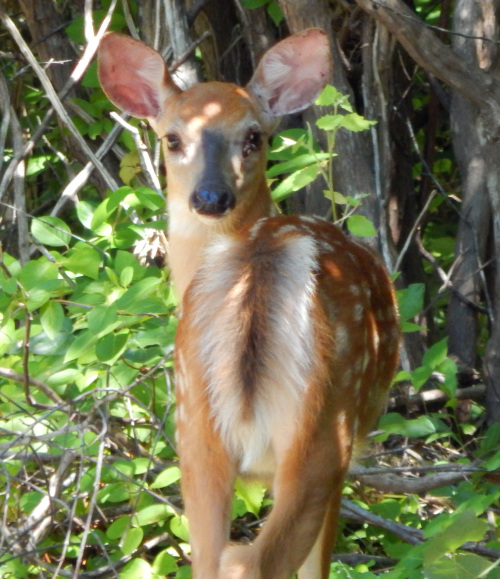 an unexpected meeting along a wooded path