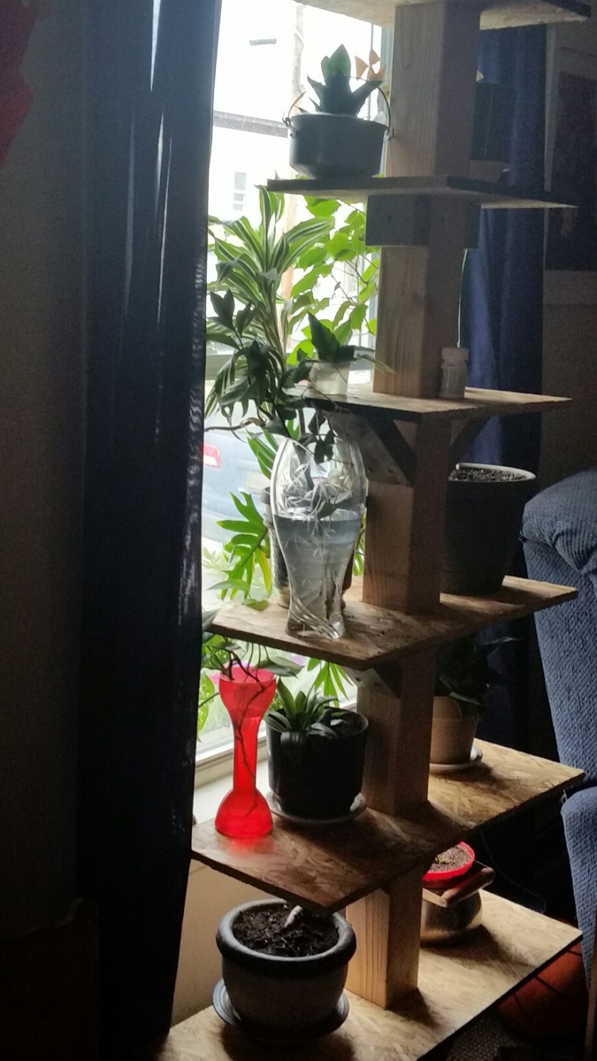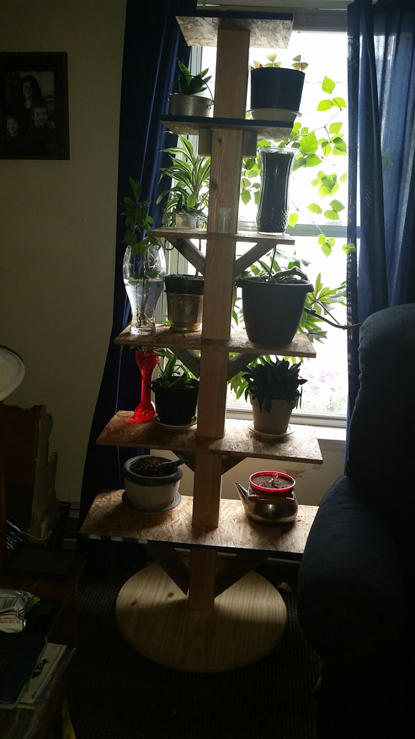 I have a few plants and the place I’m living in doesn’t have many windows that my plants like. I started looking a pricing and thought about what i wanted. I new i had limited space and also needed to have as many as possible fit. I had a few different ideas in mind but the price of them all was 50- 150. NOPE. So, I started measuring and sketching. Now this isn’t finished, I need to sand the tops , stain, then add the trim. But, we brought it in to see how I did on the numbers and design to see if anything needed adjusting before finishing. What do you think?