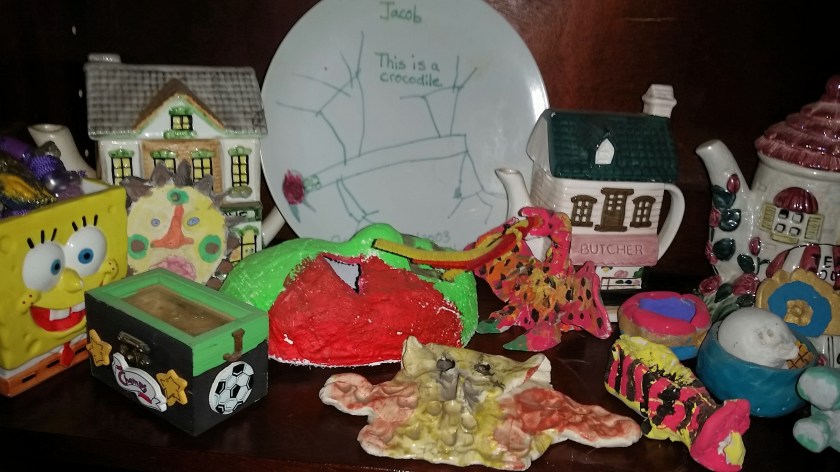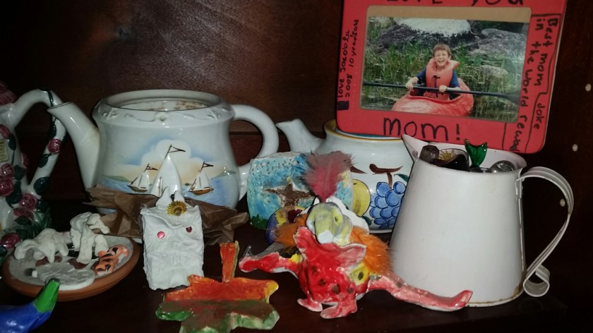 Obviously the tea pots are just there to hold things up and because this was my tea pot collections cabinet, but,I wanted my sons projects more spread out so I could see them all. I noticed how most of them are from my 18 that he made while he was in school. My 13 and I noticed that most of the things he has brought home over the years were more, paper projects. That makes me wonder about Art in our schools and just were it is going. They have noticed the clinical aspect of coloring at any age. I truly feel art can be used to help heal, it is its own therapy. As social studies and history have been debated necessary I could never see art that way. Our kids argue on why do they need to study this and that and how they will not use them ever in life after school and to a point I do agree, but then there is the few who will become history majors, or history and social studies teachers, we’re would they be? So the arguments can go on forever (,even if I am just arguing with myself!!!, lol) But not with Art, It is necessary for all youth.