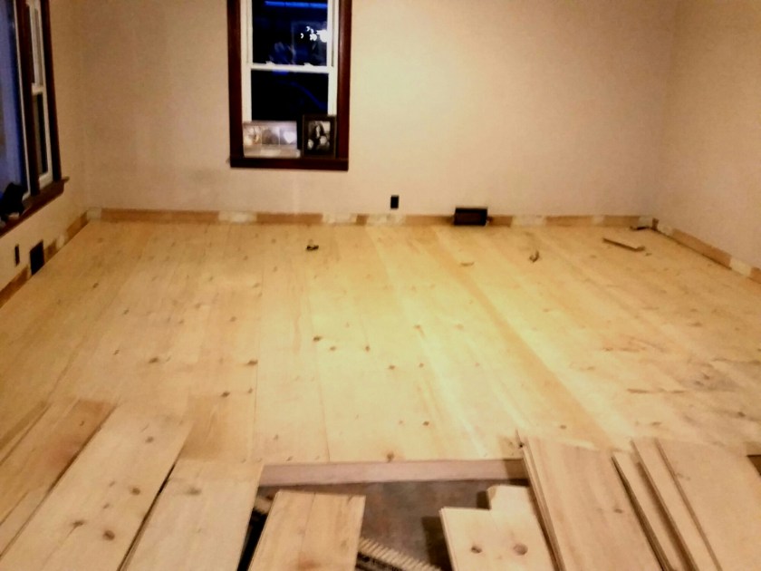 There it is, the living room floor in our new home is finally finished and it’s beautiful!!!!!!!! I love it. My man worked his butt off to finish it this weekend and he did a great job. Now the rest of the wood is for two bedrooms upstairs and then the sanding begins!! U can see a piece of the dining room floor under the pine boards. When I started pulling up linoleum in the kitchen and found the sub floor I thought for sure there was wood floor under it but I was wrong, it was more linoleum!!! I have blisters on my blisters from ripping up all the layers but the beautiful floor is worth it.