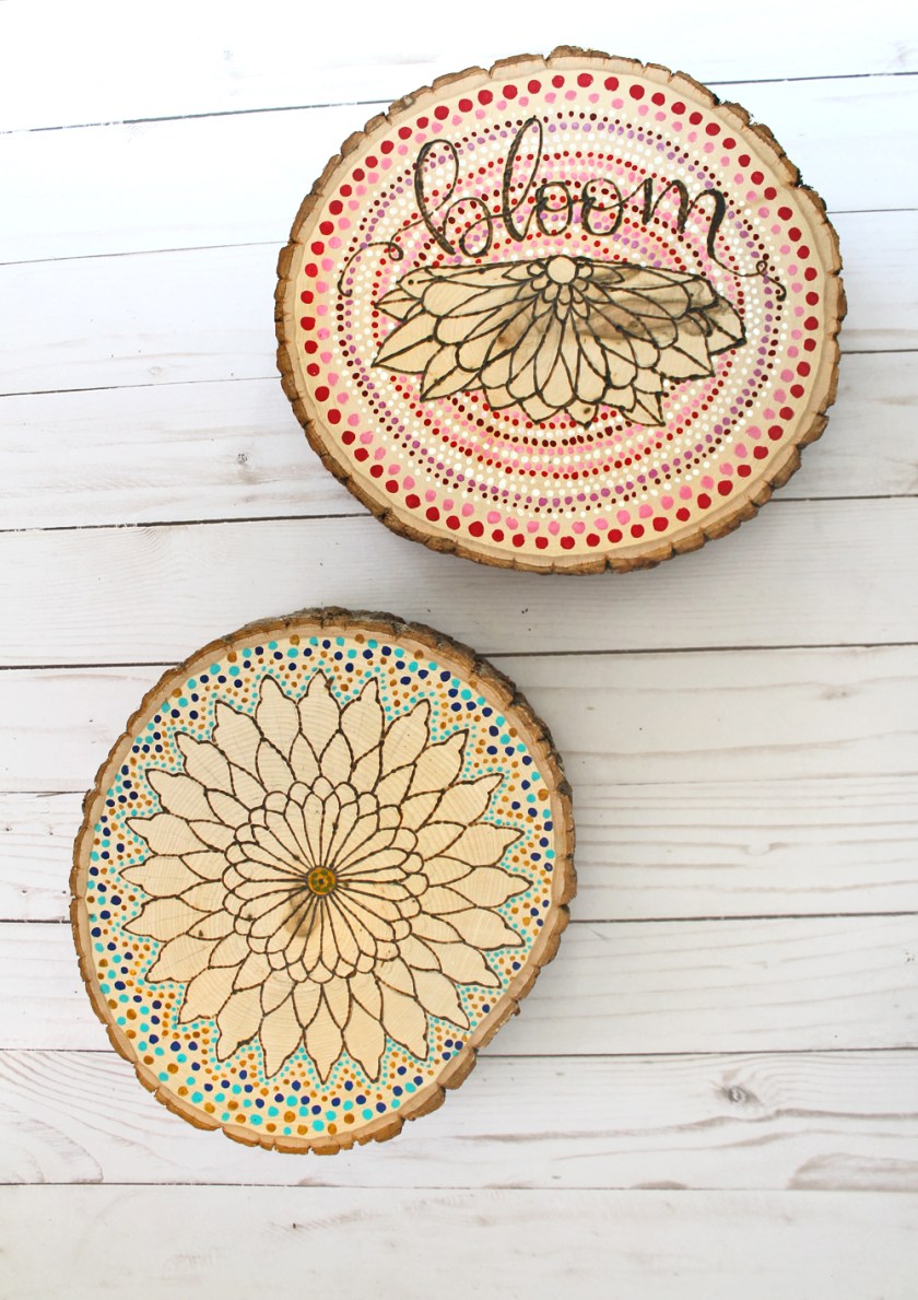 Hello everyone, It’s Katie here and I have a fun DIY to share with you inspired by Mandalas, Wood Burning and Pointillism! I combined those 3 different art forms onto a Basswood round to create a unique piece of art! Here’s how: