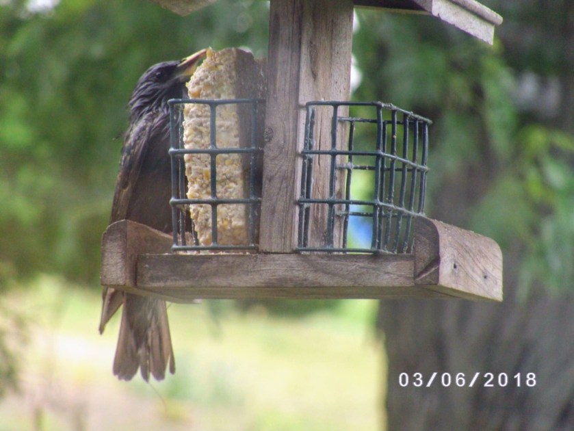 I thought I had a picture of this from the back but I can’t find it, so apparently they are young sterlings, which is what this is. The beaks will turn yellow and the feathers become different shades.