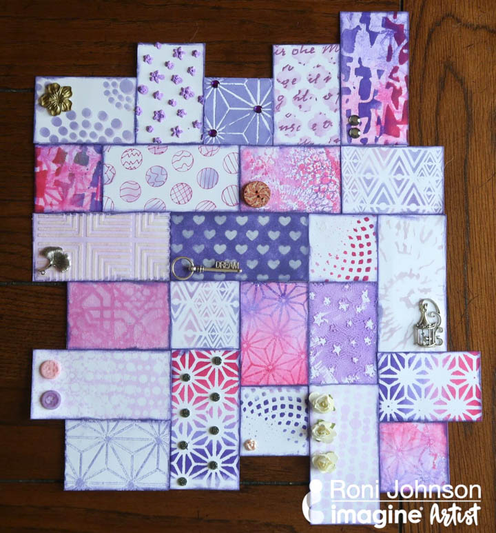 Randomly sponge 2 or more inks through a stencil. Here I used Memento which is a dye ink and VersaMagic which is a pigment ink.