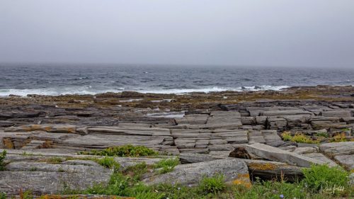 The effect of a stormy ocean creating flattened rocks along the shoreline of Maine