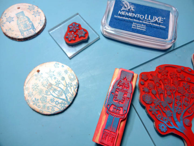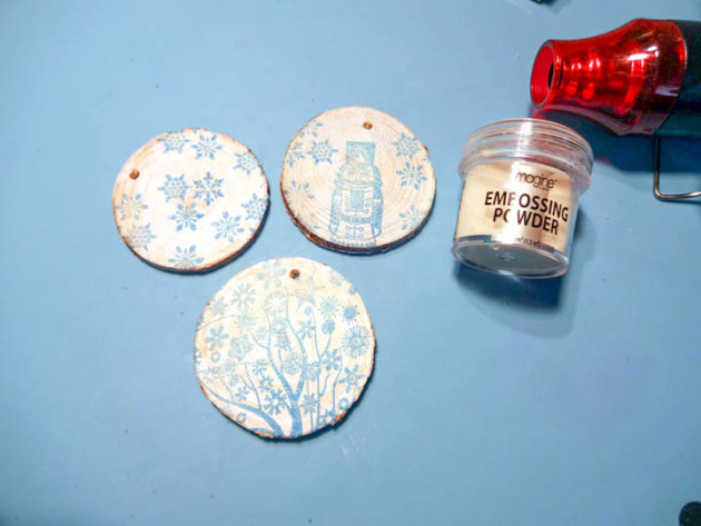 Make Christmas tree ornaments using bark slices painted with All-Purpose Ink in White and stamped with Christmas theme stamps. The surface of the wood slices are covered with Creative Medium for an iridescent result and then stamped with Memento Luxe Bahama Blue ink and sealed with clear embossing powder from Imagine. For once more the Radiant Neon Amplify in White makes the perfect snow result and works as a glue medium to add the ice crystals.