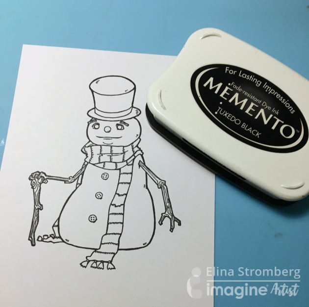Stamp and color the snowman image on white paper. When coloring with alcohol markers (like Promarkers, Copics), use water-based ink for stamping. Memento Tuxedo Black is my No. #1 choice for the task!