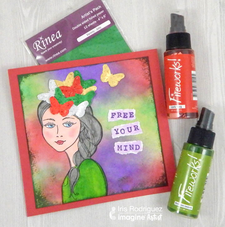 Do you ever think about things too much when you know it’s not necessary? A great way to break up this thinking pattern is to turn to creative endeavors, to “free your mind” and create what the muse wants instead. This month we have the fun challenge of creating projects with Rinea foils. There are so many funs things you can do with these foils; you can stamp on it, paint, use with mediums or create 3D decorative projects. For my card I have used foils as an embellishment, check it out.