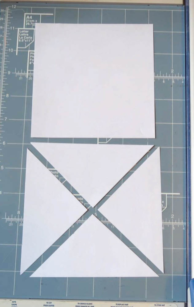 Cut copy weight white paper 4.75” x 4.75”; cut the square into triangles as shown.