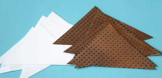 Cut Mocha/Mocha Starstruck Foiled Paper into 5” squares then into triangles. Note: You will need 9-10 triangles per ornament.