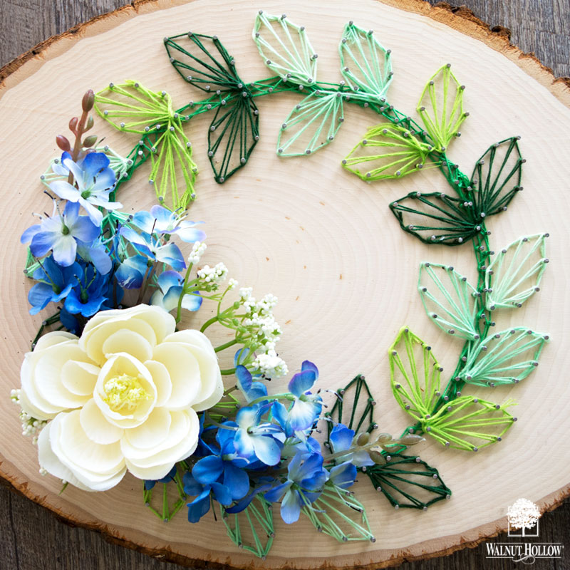String art is beautiful and trendy! It’s very simple to do, too! But you can take your string art up a notch by adding fun textures and elements to the finished product to give it some more depth and character! I made this pretty String art wreath on a beautiful Walnut Hollow Basswood Country Round wood slice, and added some silk flowers for a lovely pop of color!