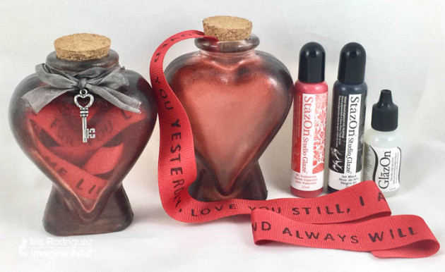Today the idea of message in a bottle is more of fun romantic notion, thanks to literature and Hollywood movies. Show some love with this heart shaped glass bottle containing a custom stamped message, on a ribbon, using StazOn ink. Embellish the bottle with StazOn Studio Glaze and other adornments.