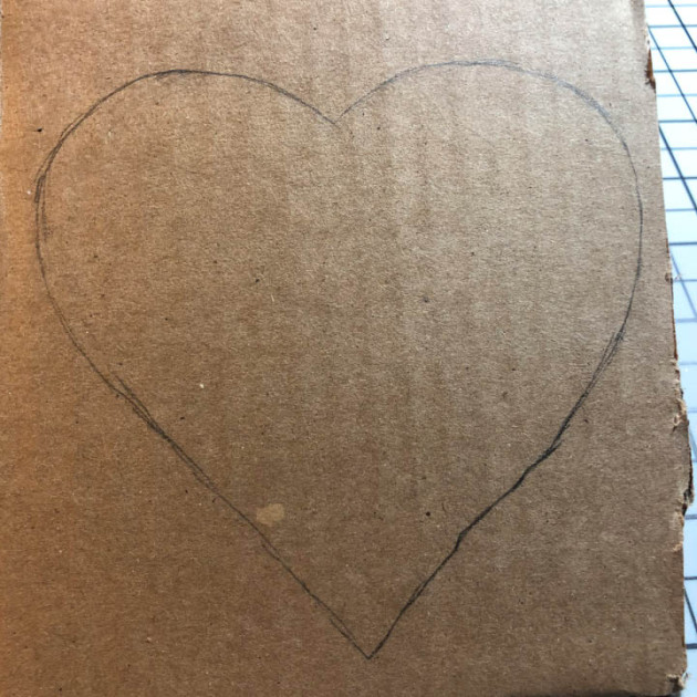 Start by drawing a heart shape (approximately 4 1/4” x 4” in size) onto a piece of corrugated cardboard. Cut out shape.