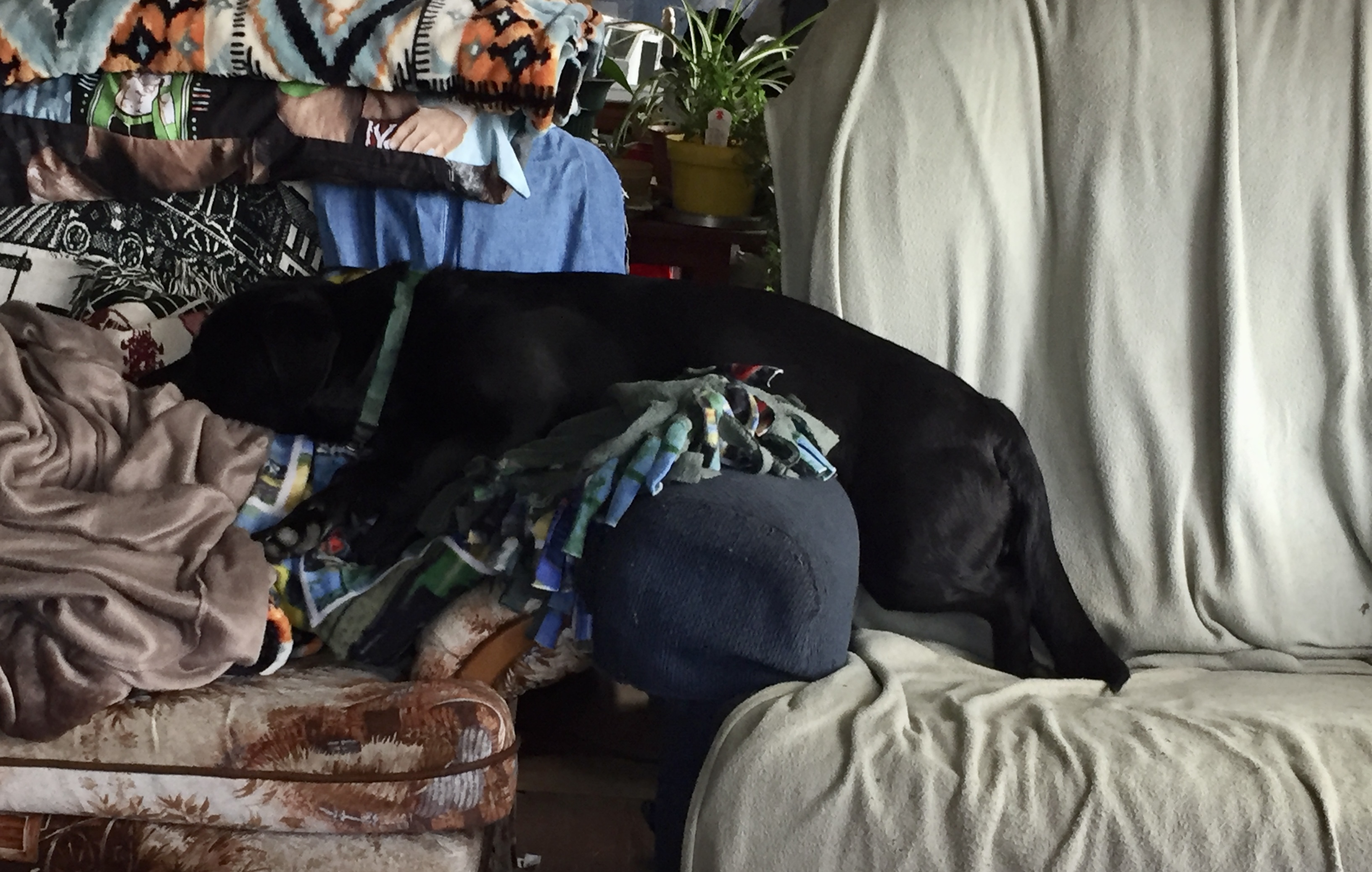 He got the drain out but still has the stitches, we tried putting socks on his feet so he won’t itch but he just rips them off. We can’t put anything on him like his collar or a cone because it’s his neck.