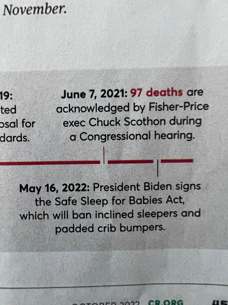 I realize having to recall a pro duct can cost thousands or more dollars but for a business who is supposed to be about children it took Consumer Reports pushing and pushing before they finally recalled this product that cause 100 infant deaths!!!