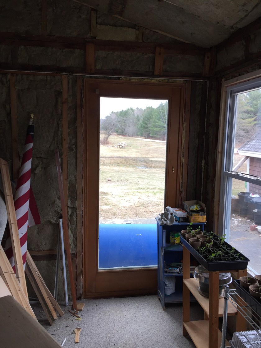 This is our now , Sun porch. We changed out the regular door with a set we bought used and put 2 of them here. If necessary the second door will open but only if it has to be. The third ” door” we turned into a window on the opposite wall that originally had nothing. That does not move. Lol then we took out all the ceiling boards and found just lots of just waste so took it all out and insulated ceiling. It adds about a foot of extra space on one side but makes a huge difference. Now I need to get something to cover them up when it gets really hot but it helped with oil this past winter!!!